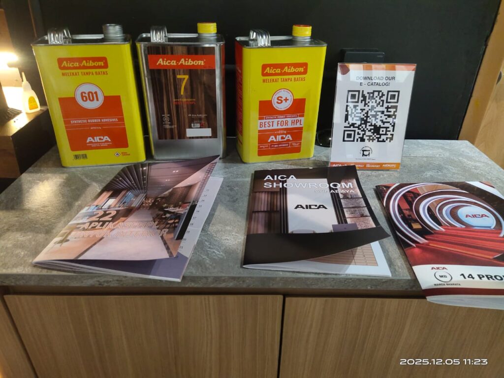 Di AICA Gallery Surabaya, anda bisa melihat berbagai macam display produk AICA seperti HPL, CERARL wall panel, ToughTop pelapis top table, hingga lem kuning legendaris Aica-Aibon. Disini juga melayani permintaan sample serta pembelian seluruh varian produk AICA.